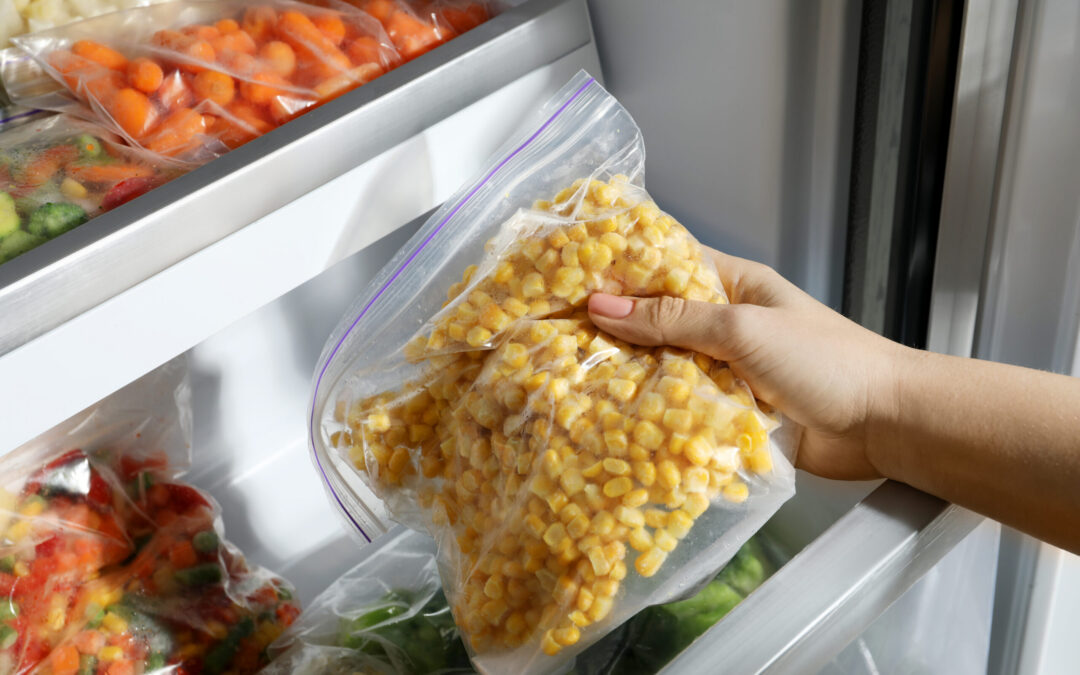 Woman taking plastic bag with frozen corn kernels from refrigerator, closeup